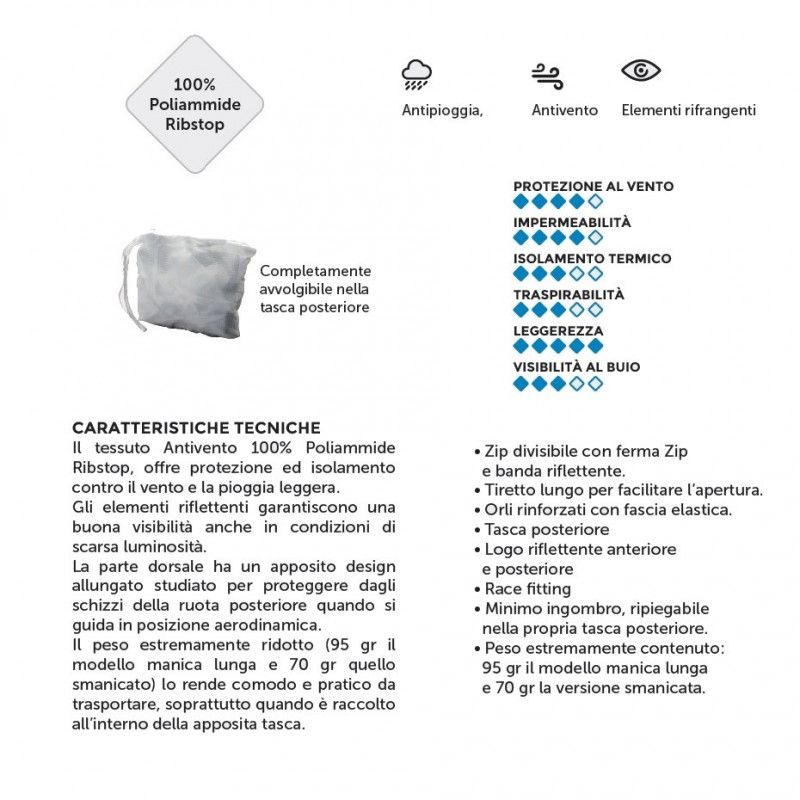 Il tessuto Antivento 100% Poliammide Ribstop, offre protezione ed isolamento contro il vento e la pioggia leggera.